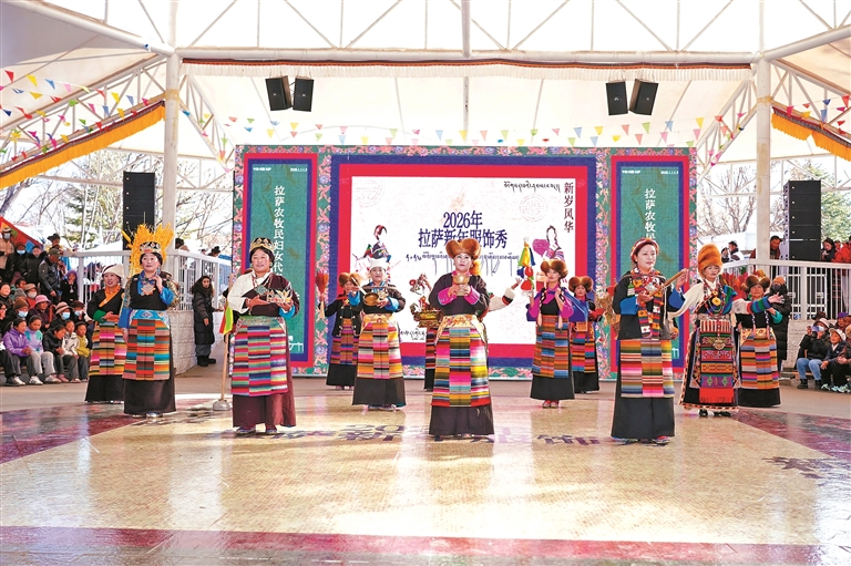 圖為2026拉薩新年服飾秀拉薩農(nóng)牧民婦女代表“村T秀”宗角祿康公園活動現(xiàn)場。