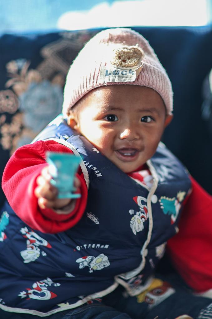 2026年1月5日,在西藏定日縣長所鄉(xiāng)雜村,長所鄉(xiāng)鄉(xiāng)黨委書記次仁旺堆(右)在次仁拉巴家中逗弄他。地震后在臨時板房居住期間,他曾當(dāng)過寶寶的臨時保姆。新華社記者 姜帆 攝