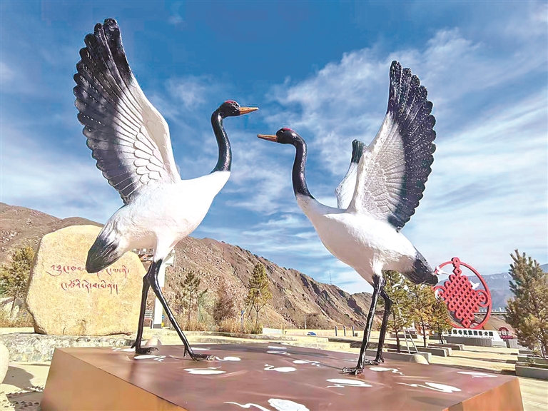 圖為哲蚌寺民族團(tuán)結(jié)主題公園內(nèi)的拉薩市鳥黑頸鶴雕塑。