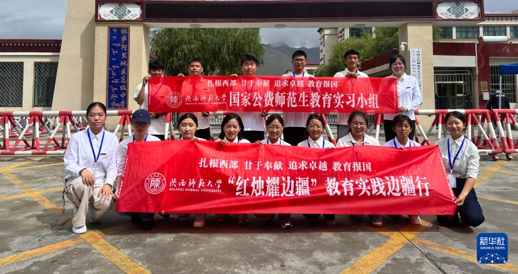 2025年8月23日,陜西師范大學(xué)國(guó)家公費(fèi)師范生教育實(shí)習(xí)小組部分成員在拉薩阿里地區(qū)高級(jí)中學(xué)合影。(受訪者供圖)