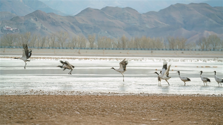 藏族歌謠唱道:“潔白的仙鶴啊,請把翅膀借我!不到遠處飛去,只到理塘就回?!焙陬i鶴是藏地傳說中的吉祥信使,是濕地生態(tài)的“活指標”,更是年年赴約的“高原歸客”。臨近春節(jié)和藏歷新年,高原因這群精靈更添生機。
