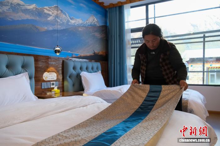 2025年11月9日,西藏林芝巴松措景區(qū)結(jié)巴村村民索朗拉姆整理客房,據(jù)悉,她的客棧擁有15間客房。江飛波 攝