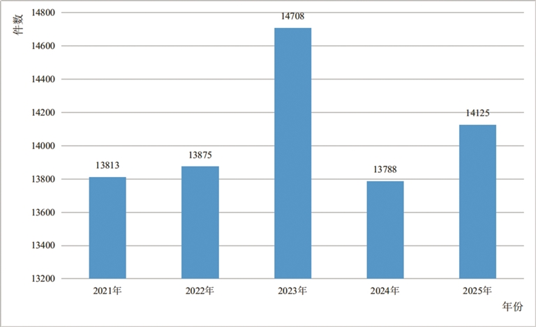 2021年—2025年全區(qū)檢察機關(guān)辦案總量變化趨勢圖