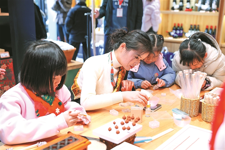 在“藏文化體驗(yàn)區(qū)”,藏香咨詢師劉曉靜(中)在指導(dǎo)孩子們制作藏香手串。本報(bào)記者 周婷婷 攝