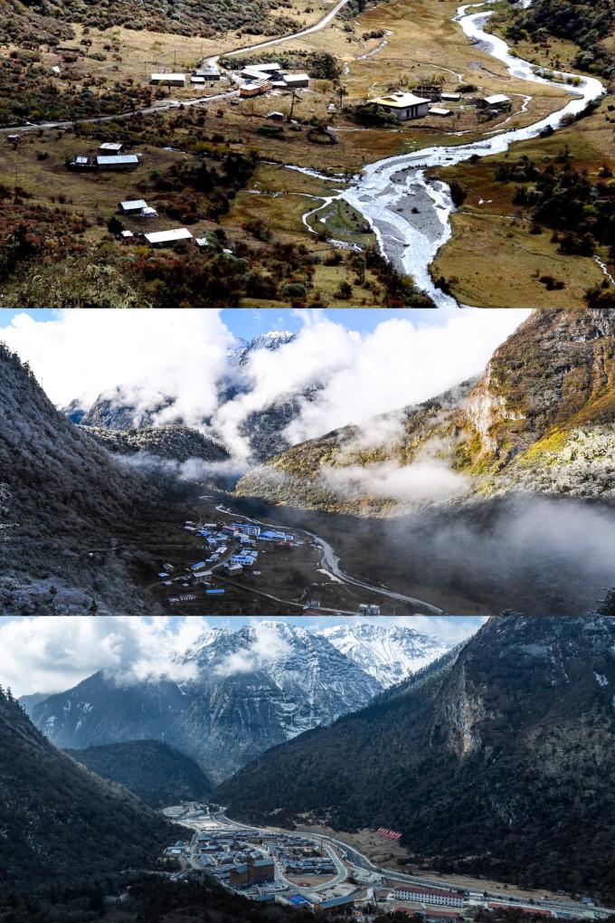 拼版照片:上圖是2003年10月26日拍攝的玉麥鄉(xiāng)(新華社記者 索朗羅布 攝);中圖是2017年10月31日拍攝的玉麥鄉(xiāng)(新華社記者 普布扎西 攝);下圖是2026年2月5日拍攝的玉麥鄉(xiāng)(無人機照片,新華社記者 丁增尼達 攝)。