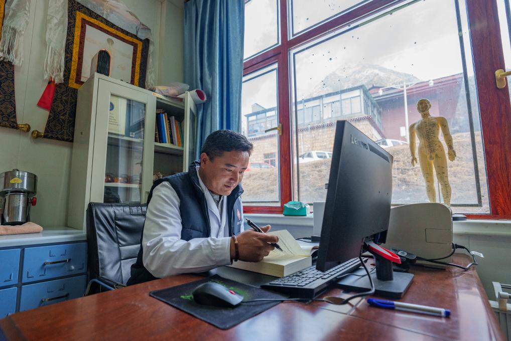 2月5日,玉麥鄉(xiāng)衛(wèi)生院副院長次旦米久在辦公室研讀藏醫(yī)書籍。新華社記者 丁增尼達 攝
