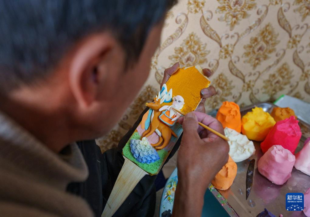 2月12日,在拉薩市林廓東路,來(lái)自西藏日喀則市仁布縣普松鄉(xiāng)的手工藝人羅布展示做好的酥油花。新華社記者 丁增尼達(dá) 攝