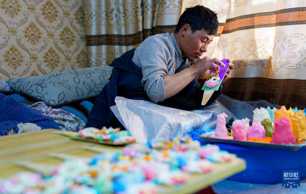 2月12日,在拉薩市林廓東路,來(lái)自西藏日喀則市仁布縣普松鄉(xiāng)的手工藝人羅布在制作酥油花。新華社記者 丁增尼達(dá) 攝