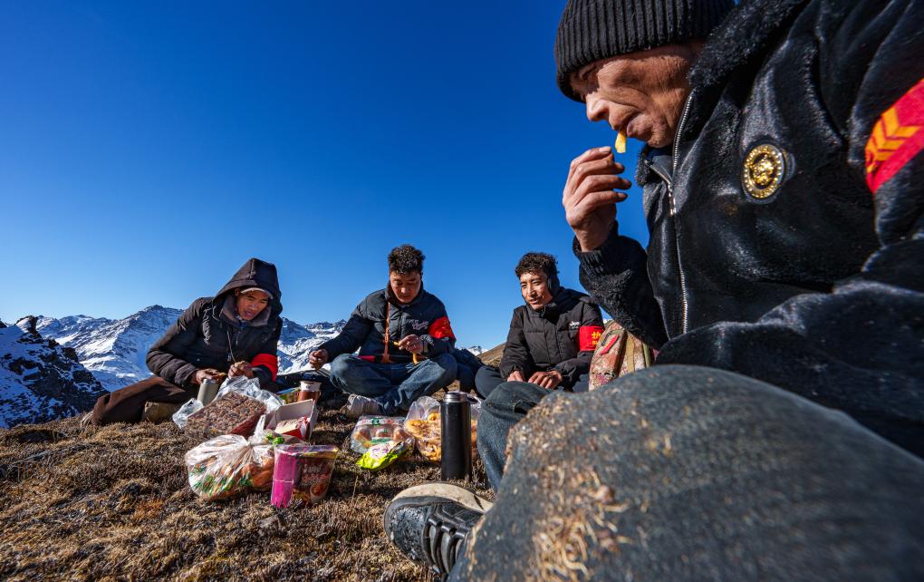 13時(shí)許,踏勘完日拉山頂10余公里的巡邊路線,護(hù)邊員們找到一塊沒(méi)有被積雪覆蓋的野草地,從背包里拿出食物,打開(kāi)裝著熱水的保溫杯,一頓簡(jiǎn)單的午餐開(kāi)始了。