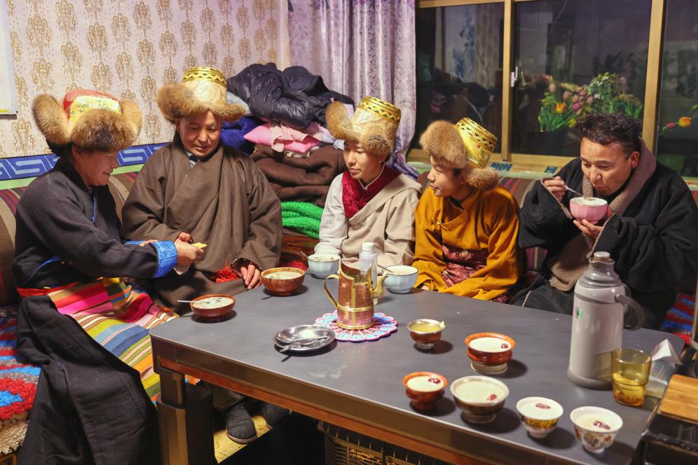 2月16日晚,桑木社區(qū)居民在家中喝“古突”。新華社記者張李聰 攝