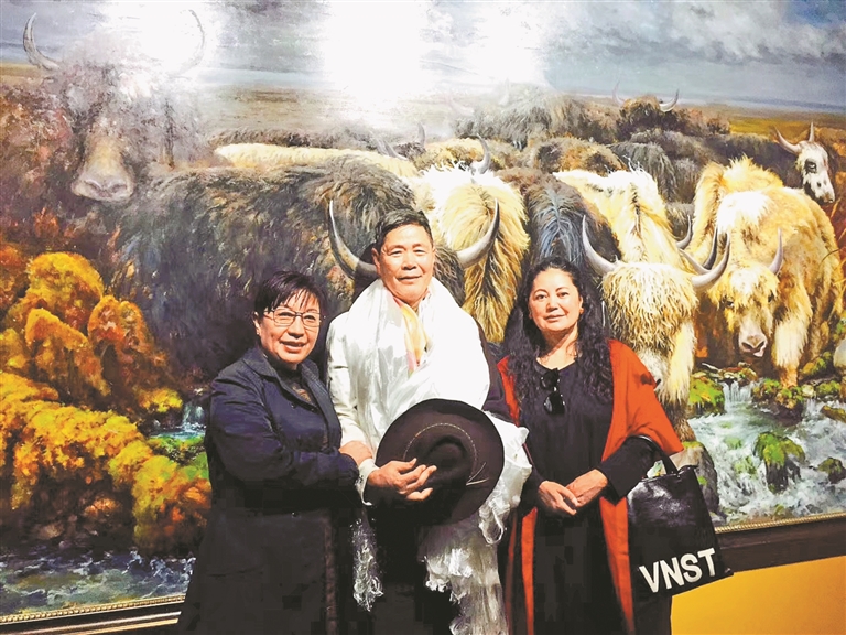 圖為唐瑟達娃(右一)和友人在畫展上合影。記者 盧文靜 攝