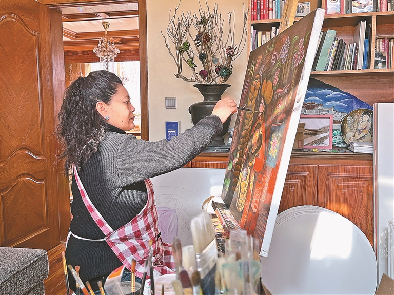 她的創(chuàng)作,始終與腳下土地的變遷同頻共振。從記憶中塵土飛揚的拉薩街巷,到如今南北山披綠、現(xiàn)代樓宇與傳統(tǒng)院落和諧共生的新城,她既是見證者,也是記錄者。