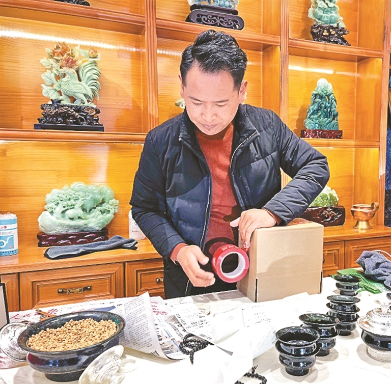 圖為銷售負責人曲朗在對玉石碗打包裝箱。記者 扎西頓珠 攝