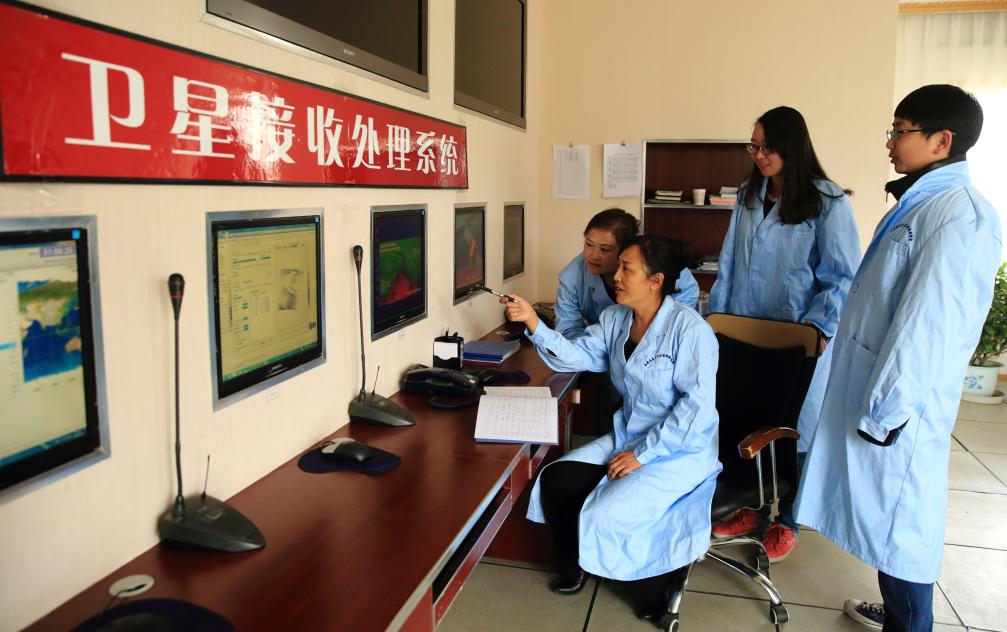 扎西央宗(左二)正在和同事探討遙感業(yè)務(wù)。(受訪單位供圖)