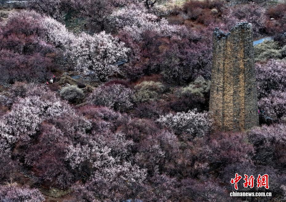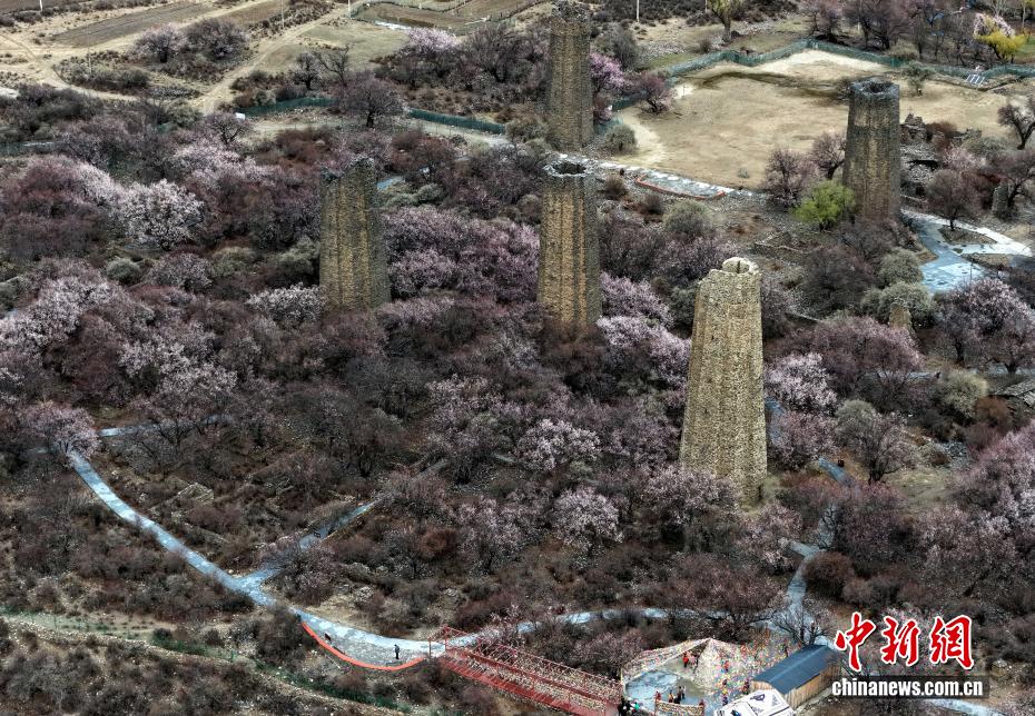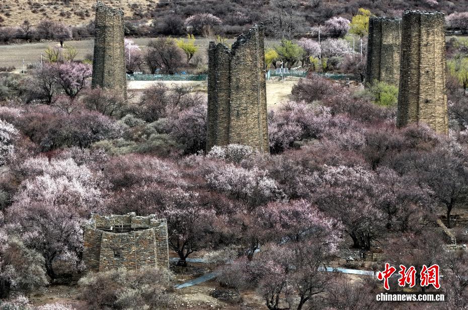3月27日,西藏林芝市工布江達(dá)縣秀巴古堡群下桃花綻放。時(shí)下,西藏林芝市的千余株野生桃樹次第綻放,美不勝收。(無(wú)人機(jī)照片)中新社記者 李林 攝