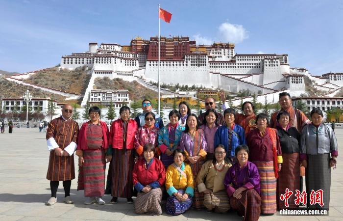 圖為4月22日,來自不丹的游客在西藏拉薩布達(dá)拉宮廣場合影留念。中新社記者 李林 攝