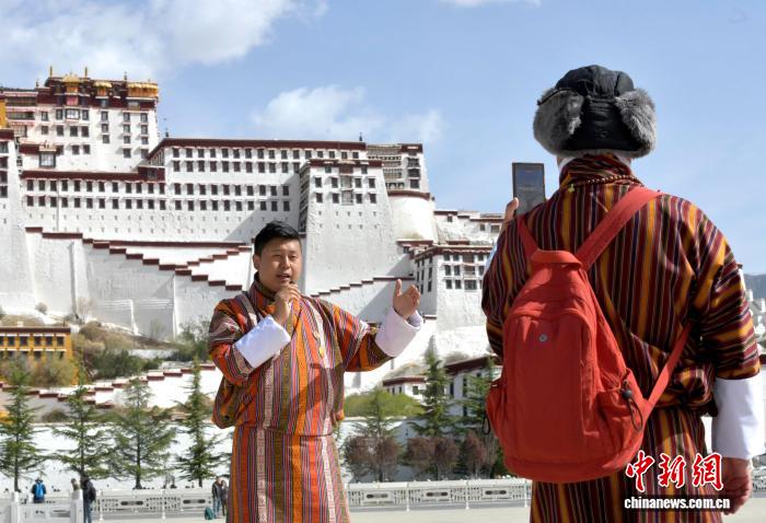 圖為4月22日,來自不丹的游客在西藏拉薩布達(dá)拉宮廣場拍攝視頻。中新社記者 李林 攝