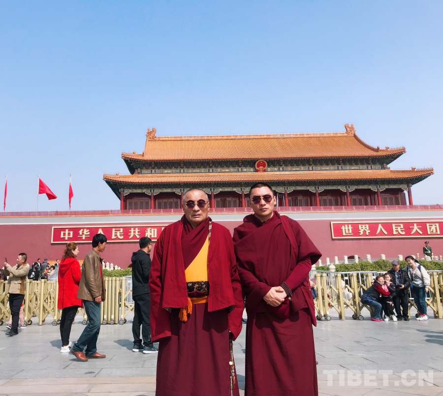 圖為根培活佛(右)在天安門(mén)拍照留念