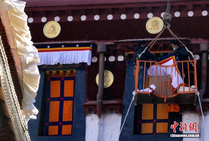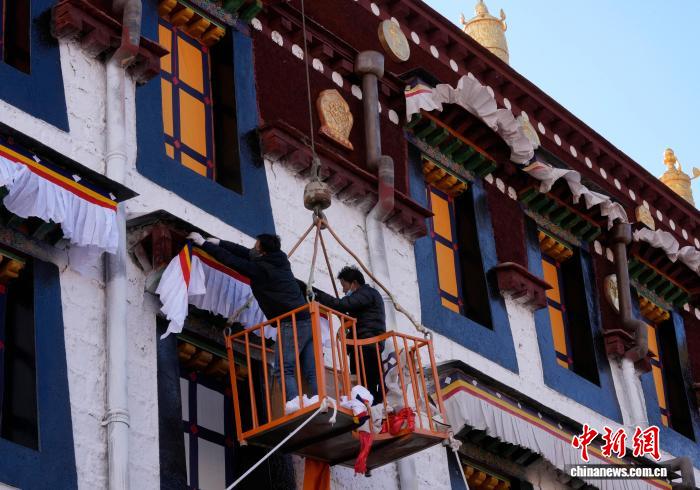2月5日,西藏大昭寺更換“香布”,迎藏歷新年?!跋悴肌笔遣厥浇ㄖ难b飾,通常用五彩棉布縫制,主體為白色,搭配紅藍(lán)黃等色的邊沿,對(duì)窗沿等的顏料及木構(gòu)件起到保護(hù)作用。圖為工人們正乘坐吊車(chē)更換大昭寺“香布”。中新社記者 李林 攝