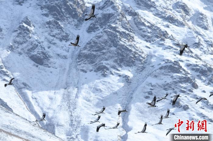 圖為拉薩林周縣黑頸鶴保護(hù)區(qū)內(nèi),黑頸鶴在雪山翱翔。貢嘎來松 攝