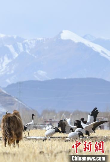 圖為拉薩林周縣黑頸鶴保護(hù)區(qū)內(nèi),黑頸鶴正在覓食、嬉戲。貢嘎來松 攝