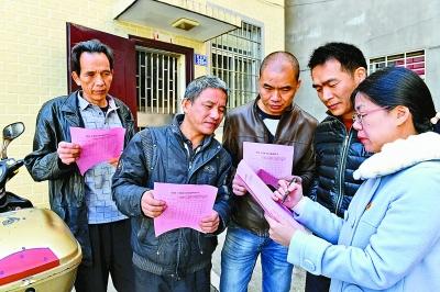 福建省福清市宏路街道紀(jì)檢干部(右一)在新倉村向村民分發(fā)黨員干部作風(fēng)問卷調(diào)查表。新華社記者 張國俊攝