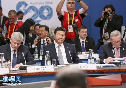 2014年11月15日,二十國(guó)集團(tuán)領(lǐng)導(dǎo)人第九次峰會(huì)在澳大利亞布里斯班舉行。國(guó)家主席習(xí)近平出席會(huì)議并發(fā)表題為《推動(dòng)創(chuàng)新發(fā)展 實(shí)現(xiàn)聯(lián)動(dòng)增長(zhǎng)》的重要講話。新華社發(fā)