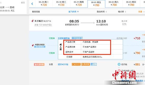 記者在攜程網(wǎng)上預(yù)訂6月1日北京到昆明的東方航空MU5714票價(jià)為710元(2.8折),顯示“只退機(jī)建、燃油費(fèi)”“不支持產(chǎn)品更改”。