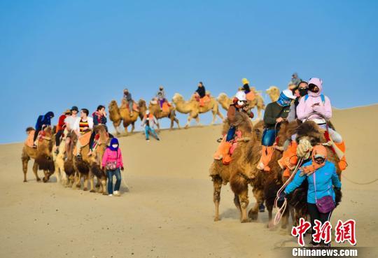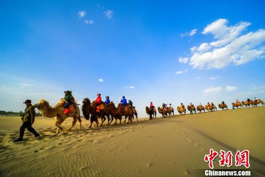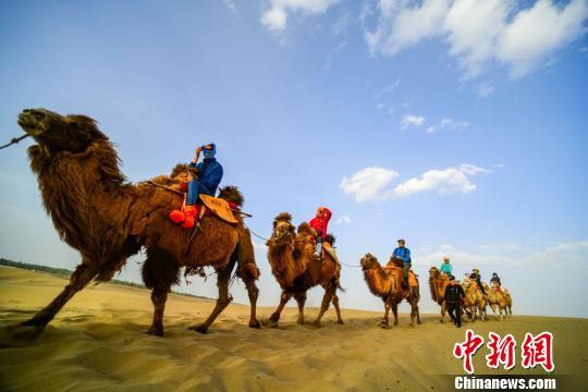 圖為大批游客騎駱駝體驗(yàn)敦煌大漠風(fēng)光。 王斌銀 攝