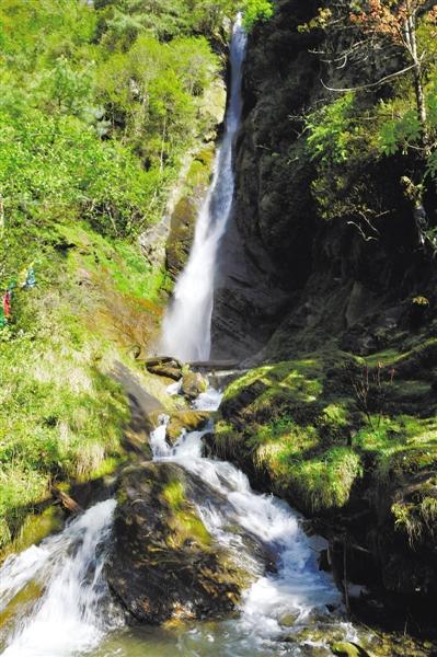 終于到了崗亭瀑布,飛濺的水花在陽光下晶瑩剔透,與四周蔥郁的森林動靜相宜。當我們爬到山頂,也就是在第三層瀑布上時,勒布溝又給了我們一個大大的驚喜——一道彩虹懸掛在瀑布旁邊,如夢如幻,美不勝收。