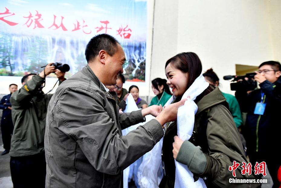 9月27日,四川九寨溝景區(qū)試開園迎來首批游客。九寨溝風(fēng)景區(qū)經(jīng)過兩年災(zāi)后恢復(fù)重建,從即日起開始恢復(fù)接待團(tuán)隊(duì)游客,每日限流5000人。圖為景區(qū)工作人員為第一位檢票進(jìn)入景區(qū)的游客獻(xiàn)上哈達(dá)。中新社記者 安源 攝