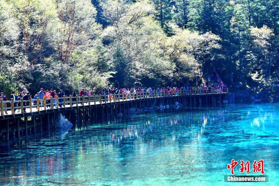 9月27日,四川九寨溝景區(qū)試開園迎來首批游客。九寨溝風(fēng)景區(qū)經(jīng)過兩年災(zāi)后恢復(fù)重建,從即日起開始恢復(fù)接待團(tuán)隊(duì)游客,每日限流5000人。圖為游客在五彩池景點(diǎn)參觀。中新社記者 安源 攝