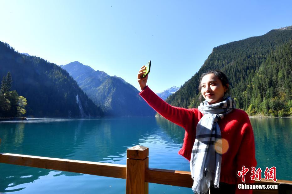 9月27日,四川九寨溝景區(qū)試開園迎來首批游客。九寨溝風(fēng)景區(qū)經(jīng)過兩年災(zāi)后恢復(fù)重建,從即日起開始恢復(fù)接待團(tuán)隊(duì)游客,每日限流5000人。圖為游客在長(zhǎng)海景點(diǎn)自拍留念。中新社記者 安源 攝