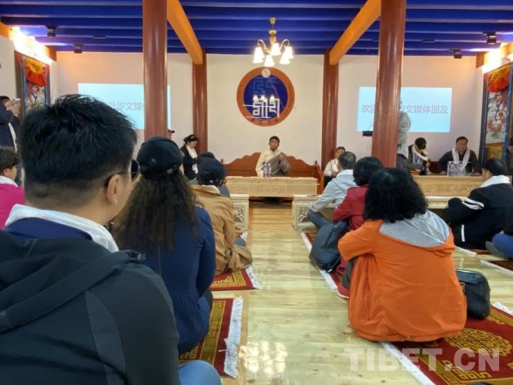 圖為松潘縣象藏藝術學校創(chuàng)辦人赤增饒旦為華文媒體記者介紹學校及唐卡傳承情況