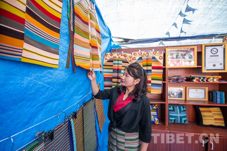 中國(guó)西藏網(wǎng)訊 10月13日,西藏自治區(qū)山南市貢嘎縣第二屆七彩邦典文化旅游節(jié)農(nóng)牧產(chǎn)品展銷會(huì)的現(xiàn)場(chǎng),旦增卓嘎在推銷著自家制作的邦典(藏式圍裙),不大的展位前放著合作社制作的產(chǎn)品宣傳片和國(guó)家級(jí)非物質(zhì)文化遺產(chǎn)代表性項(xiàng)目藏族邦典、卡墊織造技藝的代表性傳承人證書。