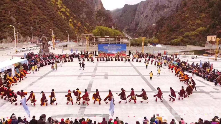 圖為江達(dá)縣崗?fù)墟?zhèn)紅旗廣場上表演的昌都百人大鍋莊
