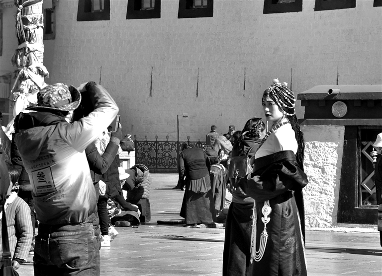 梳著彩辮,搖著轉(zhuǎn)經(jīng)筒,悠游名勝古跡,細(xì)細(xì)品味西藏氛圍,然后在八廓街古老的街道和庭院里拍一組西藏特色的藏裝照。隨著“冬游西藏”的熱度提升,來(lái)西藏游玩的游客也逐漸增多,在游玩的同時(shí)專門(mén)拍上一組濃郁地方特色的寫(xiě)真也成為眾多游客的選擇,許多攝影工作室因此客源不斷。 圖為12月11日,游客在拉薩老城區(qū)身著藏裝拍照。記者 梁梅 攝