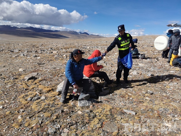 圖為救援民警向獲救游客提供食物 攝影:阿旺窮達(dá)