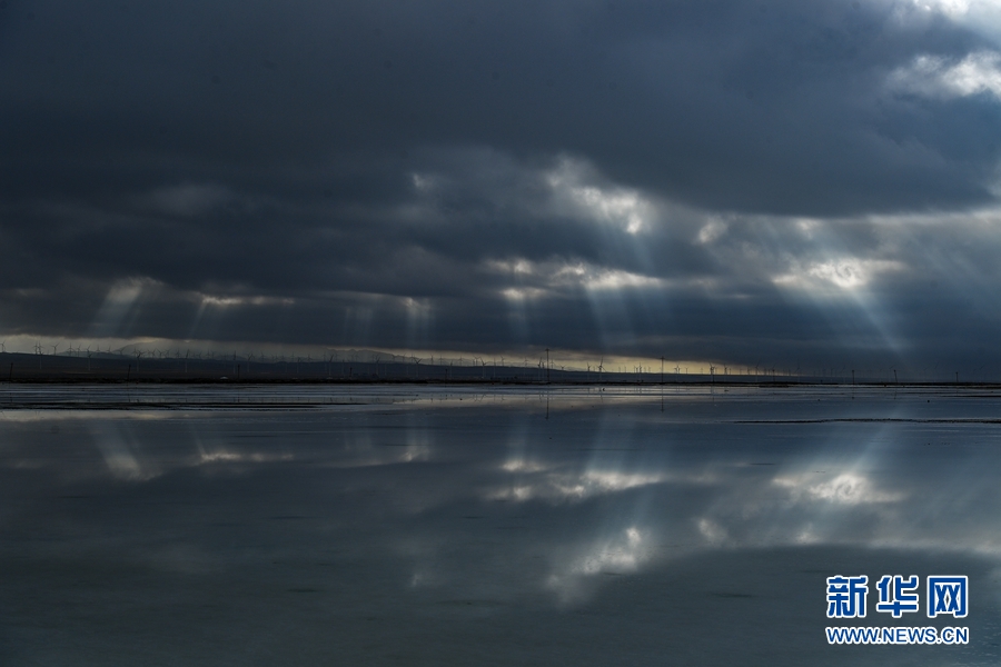 一縷縷金色的陽光透過云層的間隙,照射在干凈的湖泊上,形成茶卡鹽湖獨(dú)特的美。新華網(wǎng)發(fā)(宋忠勇攝)