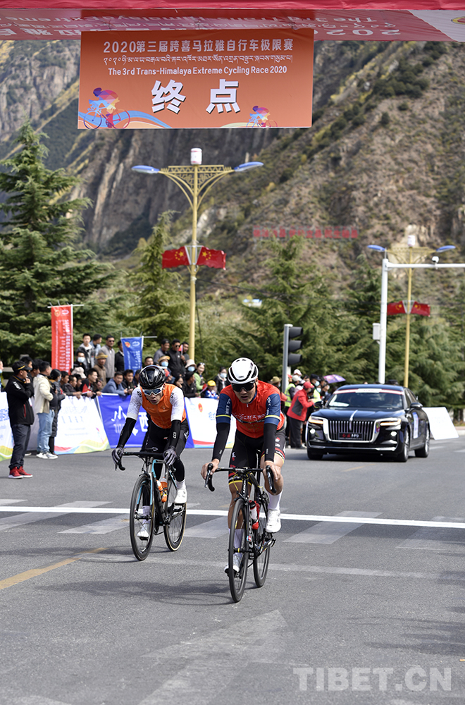 圖為2020第三屆跨喜馬拉雅自行車極限賽公路自行車賽第一段男子組參賽選手抵達(dá)終點(diǎn) 攝影:王媛媛
