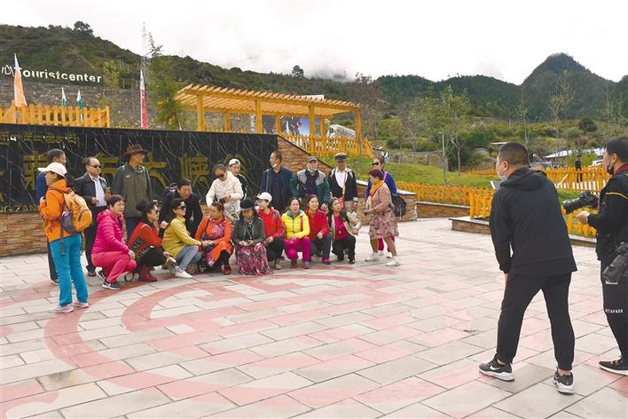 圖為來自四川的旅行團(tuán)在大峽谷景區(qū)門口合影。本報(bào)記者 張猛 胡文 攝