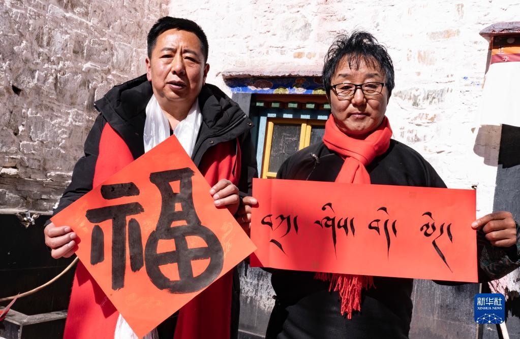 1月26日,書法家展示現(xiàn)場(chǎng)書寫的祝福字。新華社記者 普布扎西 攝