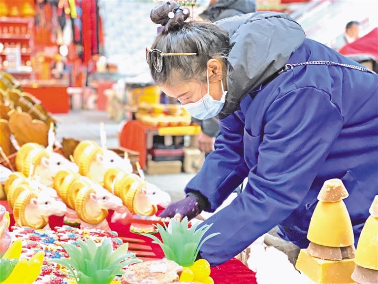 在雪域亙古浩瀚的歷史中,高原兒女自古以來(lái)便認(rèn)定“羊”是吉祥的動(dòng)物,代表了藏族群眾祈盼來(lái)年五谷豐登、六畜興旺。塑彩羊頭在藏語(yǔ)中稱為“隆果”,一般擺放在新年布置的貢品中央?!鞍謰屓ツ曩?gòu)買了一種用石灰制作的塑彩羊頭,今年我想購(gòu)買陶瓷制作的塑彩羊頭放在爸媽家,去年買的拿回自己家,這樣既環(huán)保,也讓老人開心?!笔忻袼骼释言谀曦洈偽毁?gòu)買“隆果”時(shí)說(shuō)。