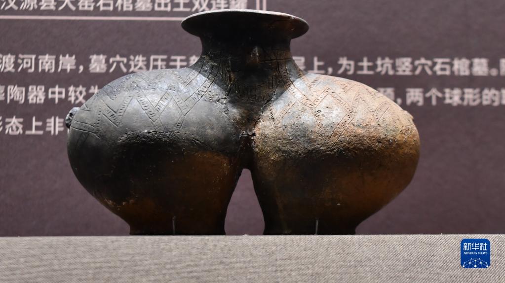 這是6月29日拍攝的西藏博物館收藏的雙體陶罐。該陶罐出土于西藏昌都卡若遺址,是新石器時(shí)代西藏陶器的代表作。新華社記者 晉美多吉 攝