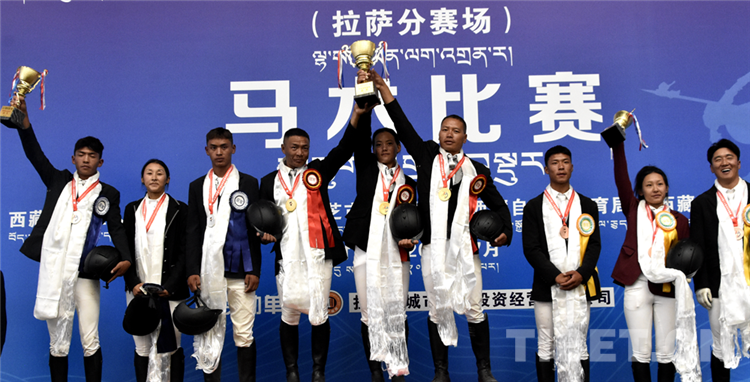 圖為7月17日競技馬術項目場地障礙團體賽頒獎現(xiàn)場(中間為冠軍日喀則市代表團,左邊為亞軍那曲市代表團,右邊為季軍昌都市代表團) 攝影:德吉卓嘎