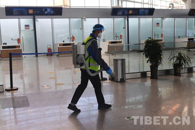 圖為拉薩貢嘎機場工作人員正在消毒 圖片由民航西藏自治區(qū)管理局提供