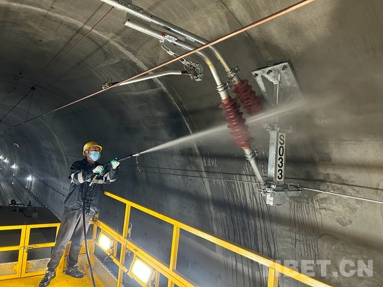 中國(guó)西藏網(wǎng)訊 初冬時(shí)節(jié),雅魯藏布江畔,秋葉繽紛、層林盡染。在穿山過江的拉林鐵路桑珠嶺隧道內(nèi)機(jī)器轟鳴、人聲鼎沸。11月14日10時(shí)25分,中國(guó)鐵路青藏集團(tuán)有限公司拉薩基礎(chǔ)設(shè)施段桑日綜合維修車間的接觸網(wǎng)工陳世召頭戴安全帽、身穿防雨服、腳踩絕緣靴,手中的高壓水槍迸射出道道白色弧線。