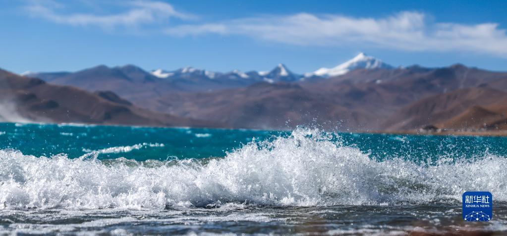 羊卓雍錯(cuò)的浪花與周邊的雪山相映成趣(1月1日攝)。新華社記者 姜帆 攝