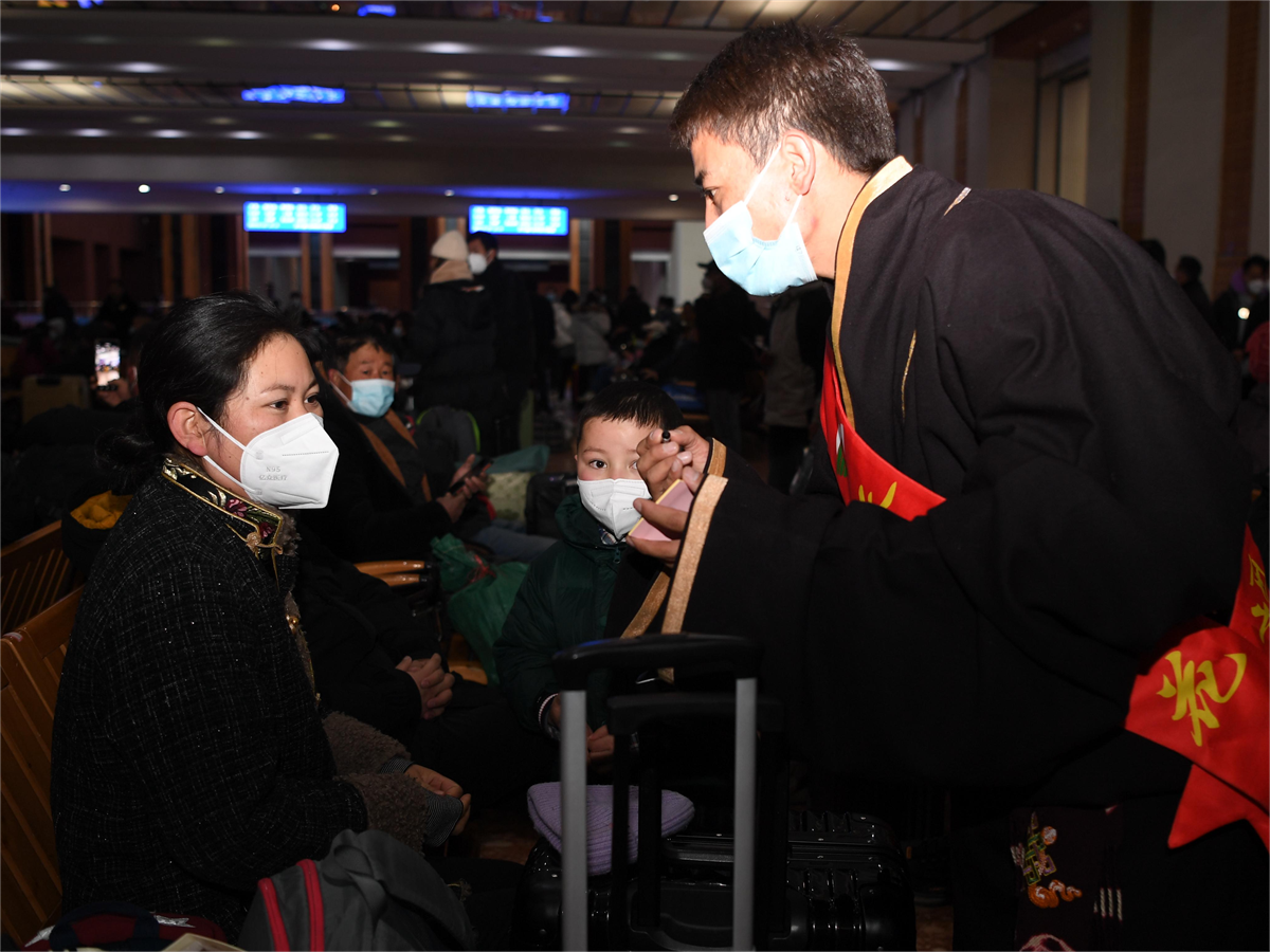 據(jù)了解,春運(yùn)首日,拉薩火車站“天路格?;ā秉h員突擊隊推出了兔年大吉心愿墻、新春猜謎送祝福、“春運(yùn)暖冬”行動等系列活動。