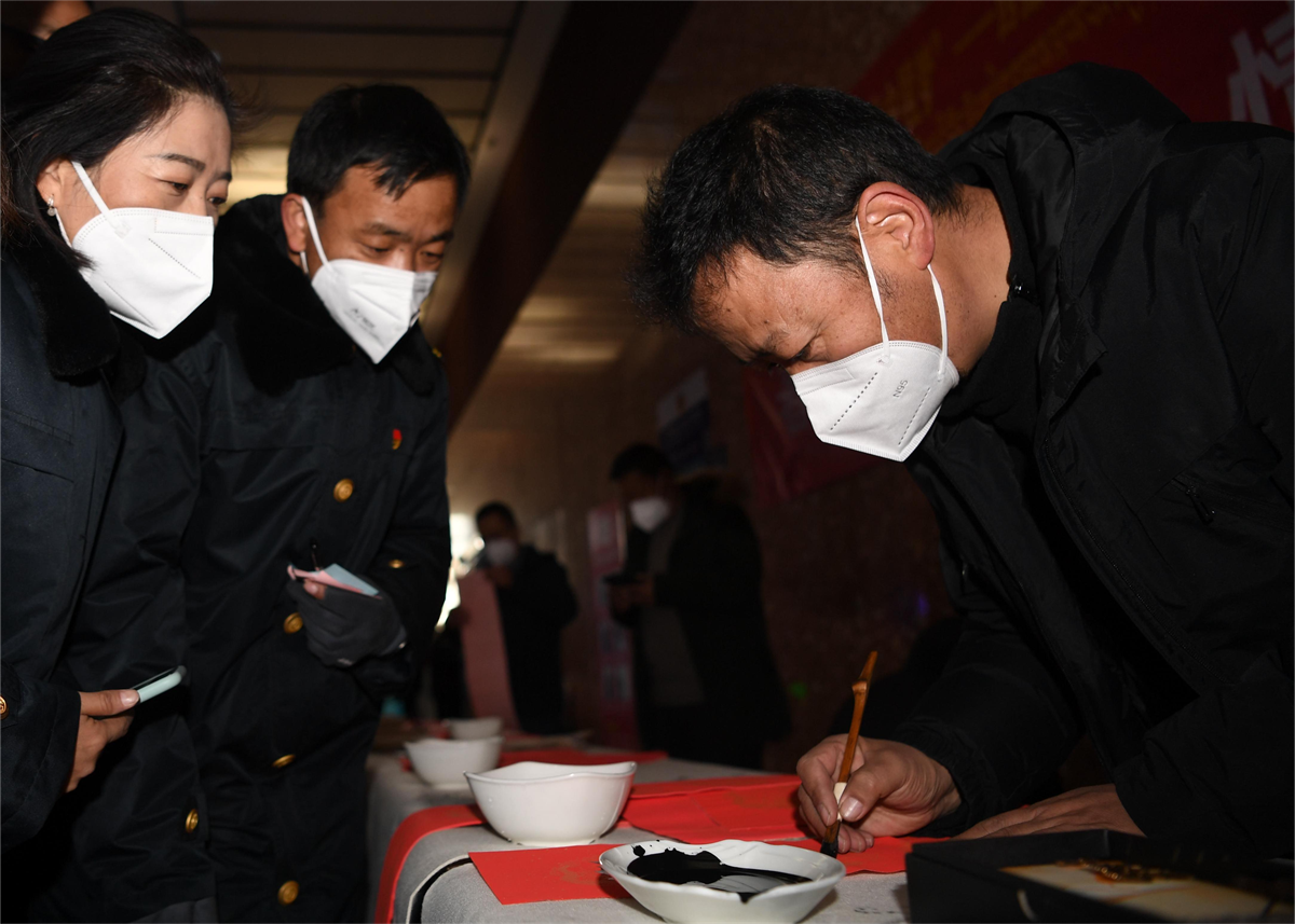 圖為西藏自治區(qū)書法家協(xié)會的書法家正在現(xiàn)場為旅客現(xiàn)場寫“?!薄S浾?唐斌 王敏 旦增蘭澤 攝